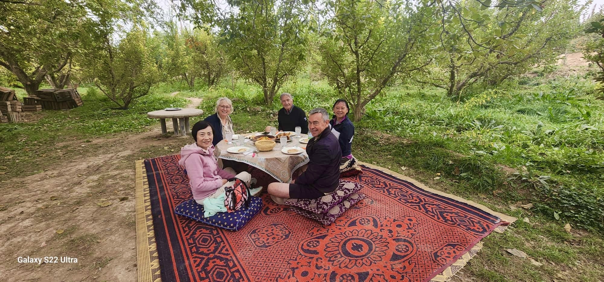 After about two hours Hassan pulls off onto a side road and we are soon parked in a farmyard where we are greeted by the owner and shown into an apple orchard where we are seated for a lunch. After miles and miles of nothing but barren rock this is a pleasant and unexpected surprise. You can see from what we are wearing that this is still at a fairly high elevation, requiring sweaters. It’s hard to believe that we are actually on the edge of the Sahara desert.