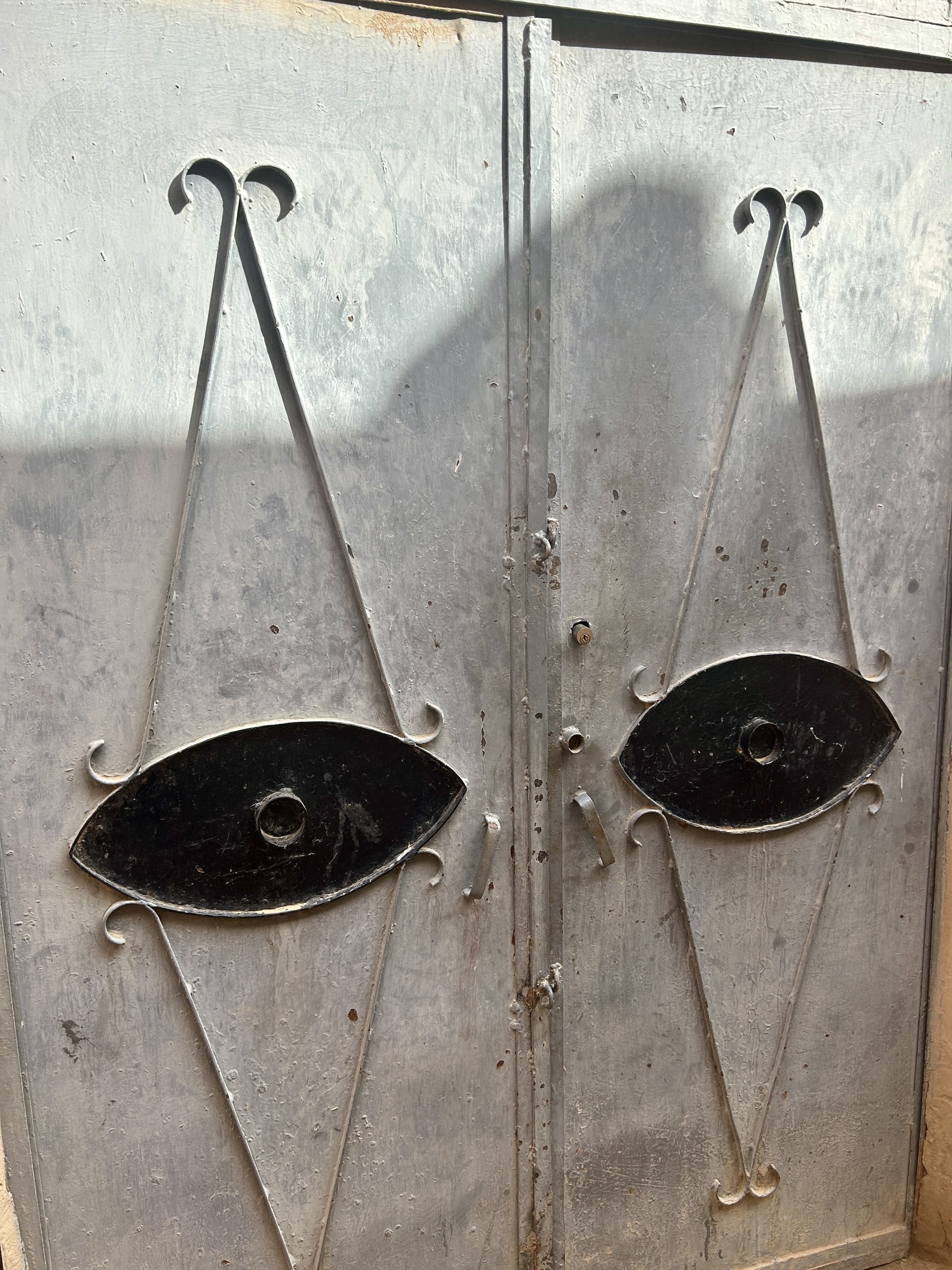 There are doors to residences, but as we have already learned from riads, no exterior windows. Many of the doors have symbols on them like these eyes that are intended to ward off evil spirits.
