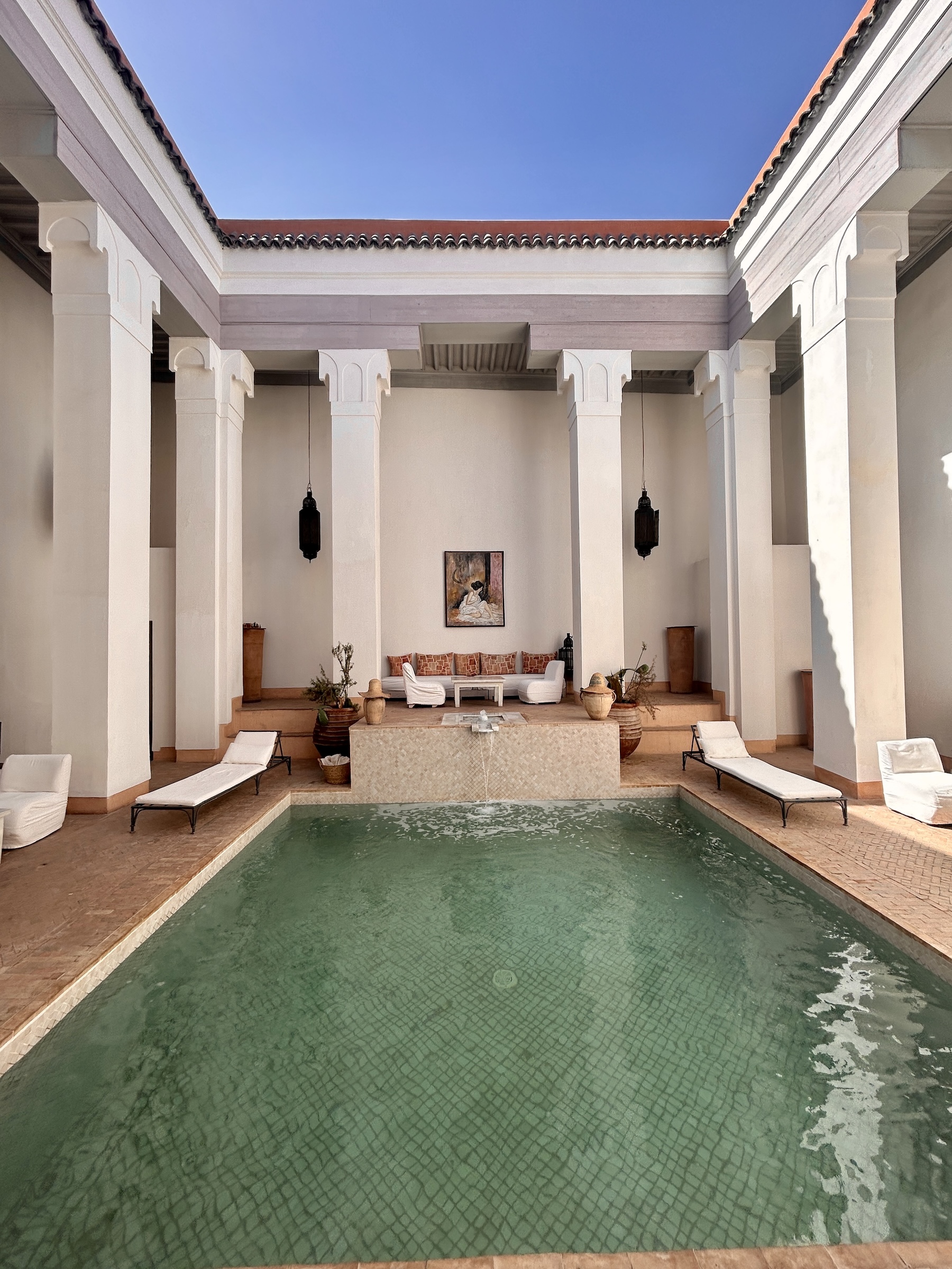 As with the riads in Fes and Essaouira, there was a central pool which was more for looks than swimming. For some reason this one brought to mind a Roman both, probably because of the columns.