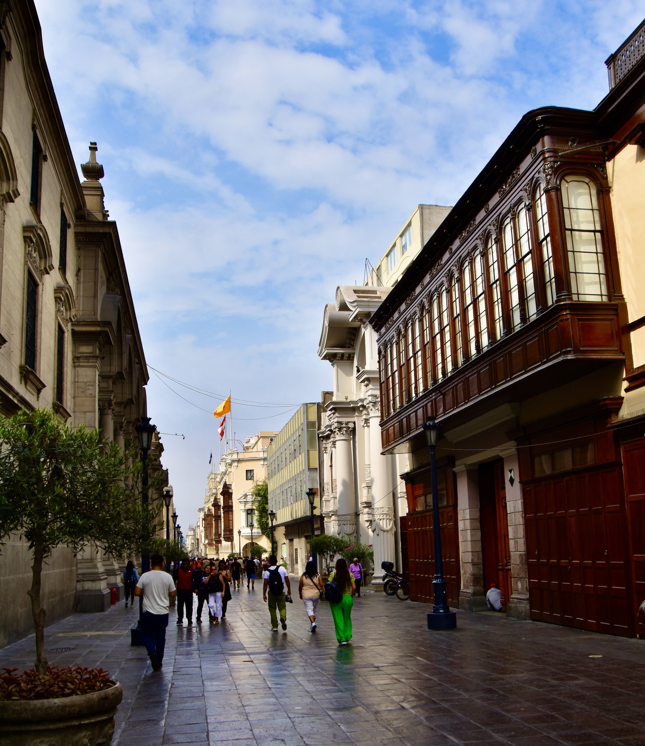 Our destination is the Plaza Mayor and we head there via this pedestrianized street lined with houses with distinct balconies that date back to the 17th and 18th centuries. They are one of the key features that make Lima’s historic district unique.